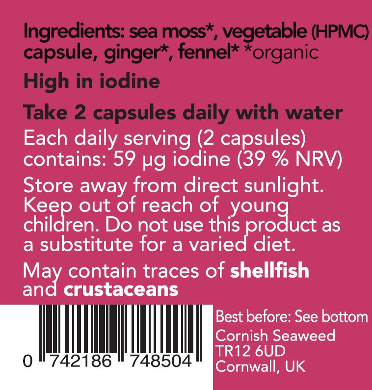 Ingredients: dried sea moss (Chondrus crispus)*, ginger*, fennel*, vegetable cellulose (HPMC) capsules *Soil Association certified organic.