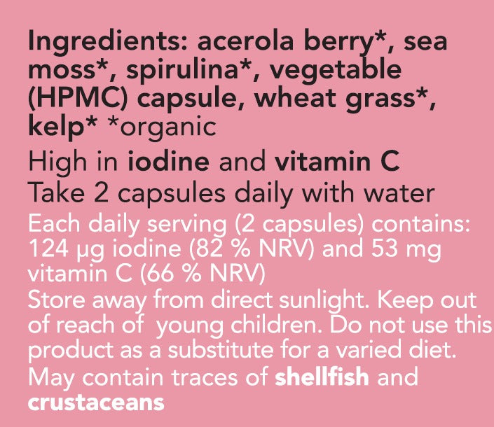 Ingredients: dried sea moss*, kelp*, wheatgrass*, spirulina*, acerola berry* vegetable (HPMC) capsules *Soil Association certified organic